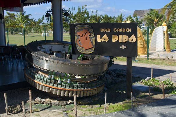 Hier war alles „All in“, naja, fast alles. Auch der Leberschaden war inkludiert. Morgens um zehn an der Strandbar: Schlangen kommen mit mitgebrachten Thermo-Bechern, gefühlter Inhalt ein halber Liter und mehr, um sich den Stoff abzuholen. Alles hochprozentig, alles stark Rum-haltig. Zwei Kellner mit einem großen Tablett beförderten im Dauerbetrieb solche Vorratsgefäße von der Strandbar zu den Abnehmern am Wasser. Sie waren sehr gut beschäftigt. Wer da den Mittag noch bei klarem Bewusstsein erlebt, der ist selbst schuld. In der Bierbar am Strand war eine Abfülllanlage als Dekorationsstück vorhanden. Sie war zwar nicht mehr in Betrieb, aber abgefüllt wurde hier dennoch reichlich.