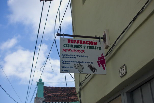 Alles wird auf Kuba repariert, neue Ware ist kaum verfügbar. Repariert wird vom Handy bis zum Staubsauger, von der Waschmaschine bis zum Bügeleisen. Eine löbliche Idee, hier aus der Not geboren. Der Händler auf dem Foto rechts unten preist Uhrreparaturen an. Wenn man sein Werkzeug sieht, muss man vermuten, dass er überwiegend Batterien austauscht und defekte Armbänder flickt. Was wir nicht ergründen konnten, weshalb der Schuh auf seinem Arbeitstisch steht. Schuhreparaturen wurden jedenfalls dort nicht angeboten.